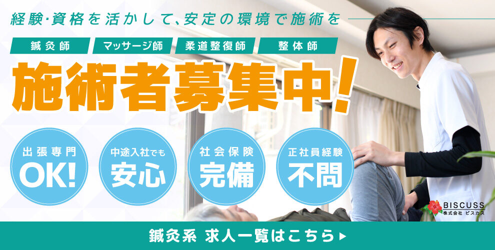 株式会社BISCUSSでは会社の規模拡大に伴い、「訪問看護スタッフ」「あん摩指圧マッサージの鍼灸・整骨院スタッフ」「介護職員」「訪問鍼灸あん摩指圧マッサージスタッフ」等の求人を募集しています。